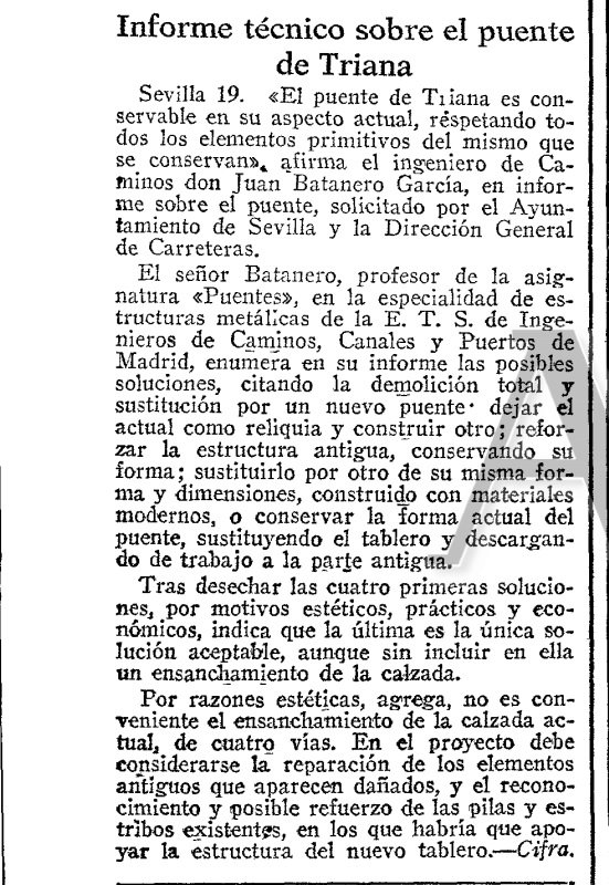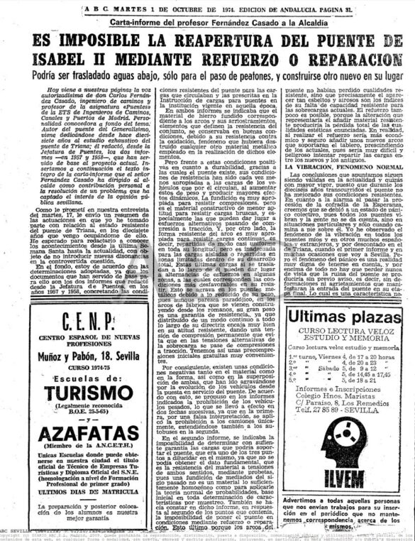 El día 1 de octubre, el ABC publicaba una carta a la alcaldía de Fernández Casado en la que reiteraba la postura que mantenía desde 1957: “Es imposible la reapertura del puente de Isabel II mediante refuerzo o reparación”.
