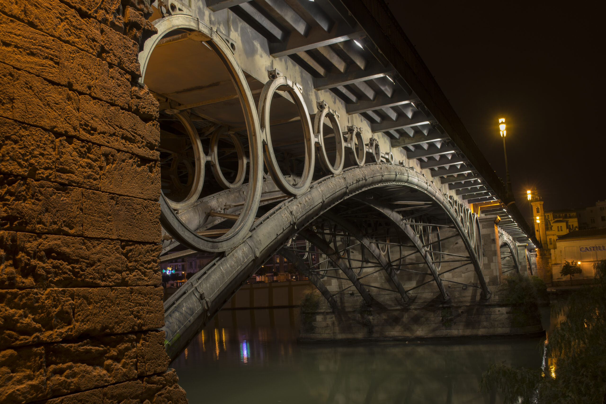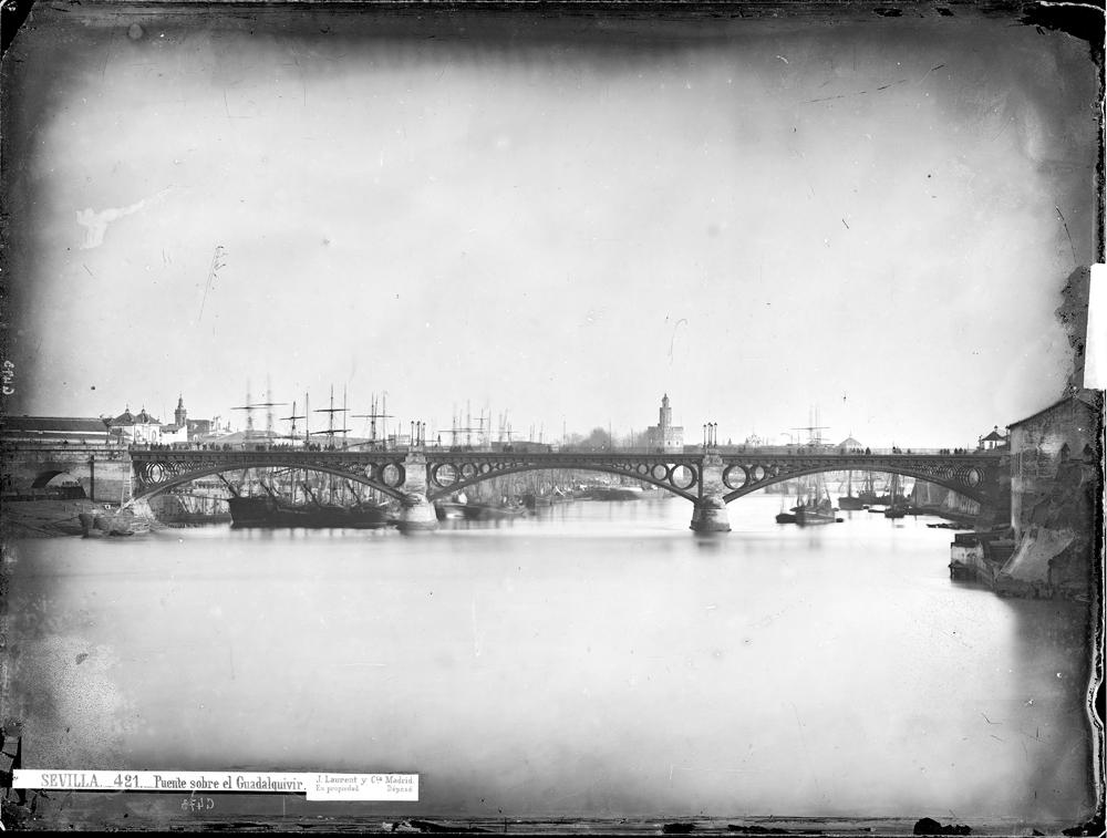 El puente de Triana de Sevilla –el de Isabel II- se forma con tres arcos iguales de 45 m de luz y responde a un proyecto de 1844 de los ingenieros franceses Fernando Bernardet y Gustavo Steinacher. Su construcción comenzó en diciembre de 1845.